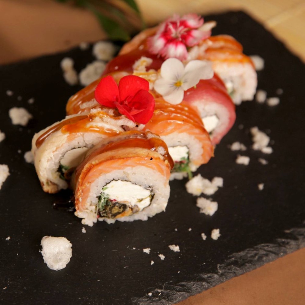 - Сакура (Креветка темпура,апельсин, ікра масаго червона , чорнила каракатиці, преміум крем сир)