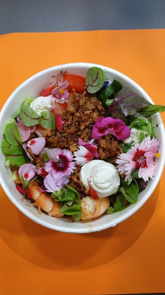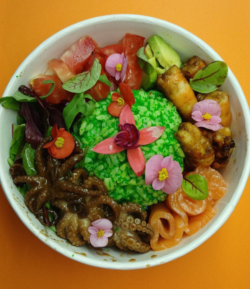 Рис, лосось, ікра масаго, крем сир, чедер, листя салату, огірок, болгарський перець, стружка тунця, соус унагі, соус спайсі.