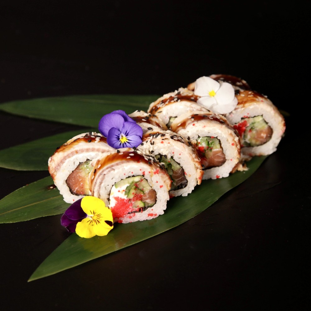 Рис, норі, крем сир, огірок,чедер,лосось,унагі соус,кунжут