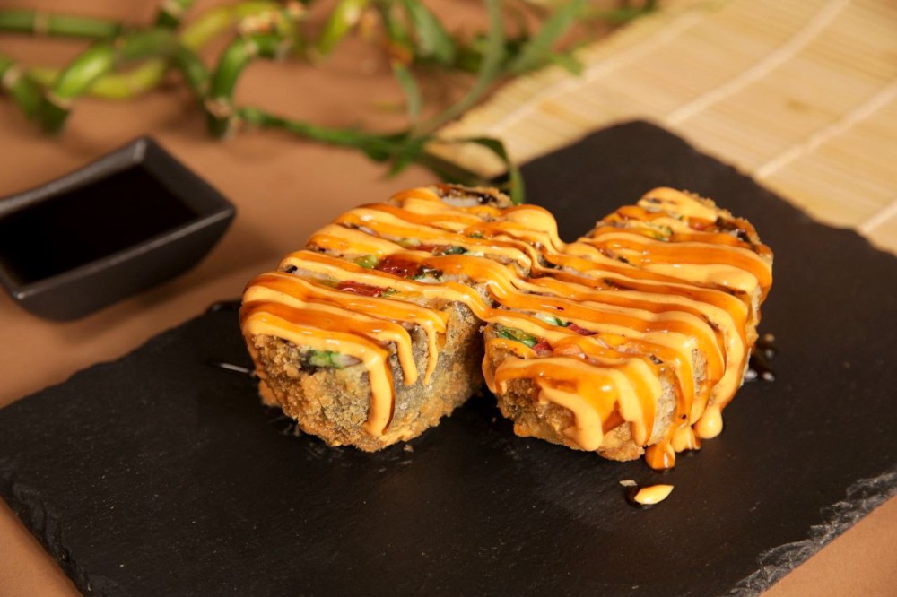 Рис, крем сир, норі, чука, авокадо, креветка, мука темпура, сухарі панко, ікра масаго, соус спайсі, соус унагі.